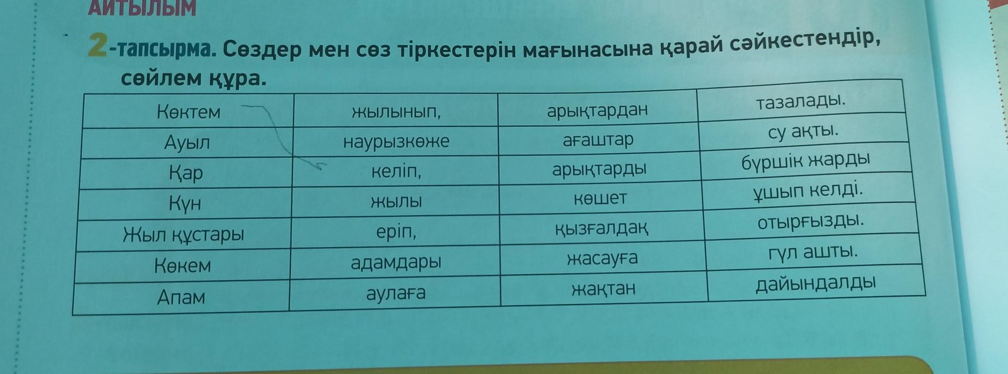 2-тапсырма. Сөздер мен сөз тіркестерін мағынасына қарай сәйкестендір сөйлем құра. Көктем тазалады. Ауыл 2 ЖЫЛЫНЫП, наурызкөже келіп, арықтардан ағаштар ) арықтарды су ақты. бүршік жарды ұшып келді. отырғызды. ЖЫЛЫ Қар Күн Жыл құстары Көкем көшет еріп, Қызғалдақ адамдары ) жасауға гүл ашты. дайындалды Апам аулаға жақтан