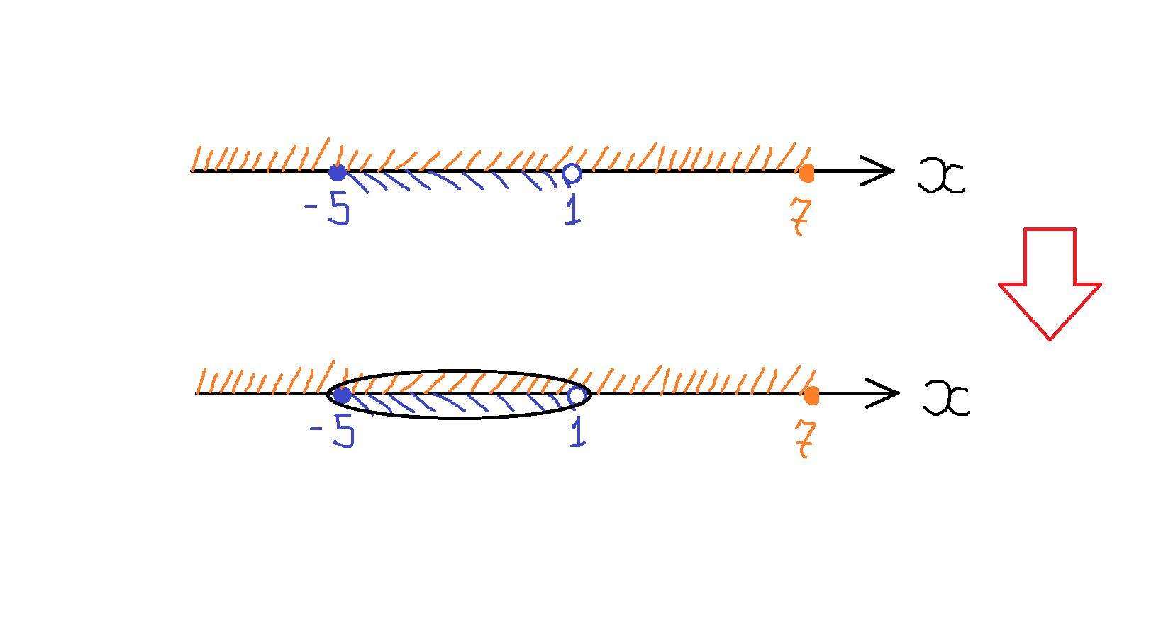 Ответ: Изобразим поочередно оба промежутка. При квадратной скобке точка будет зарисованая, при круглой - пустая. Их пересечение будет при совпадении этих промежутков, x є [-5; 1).