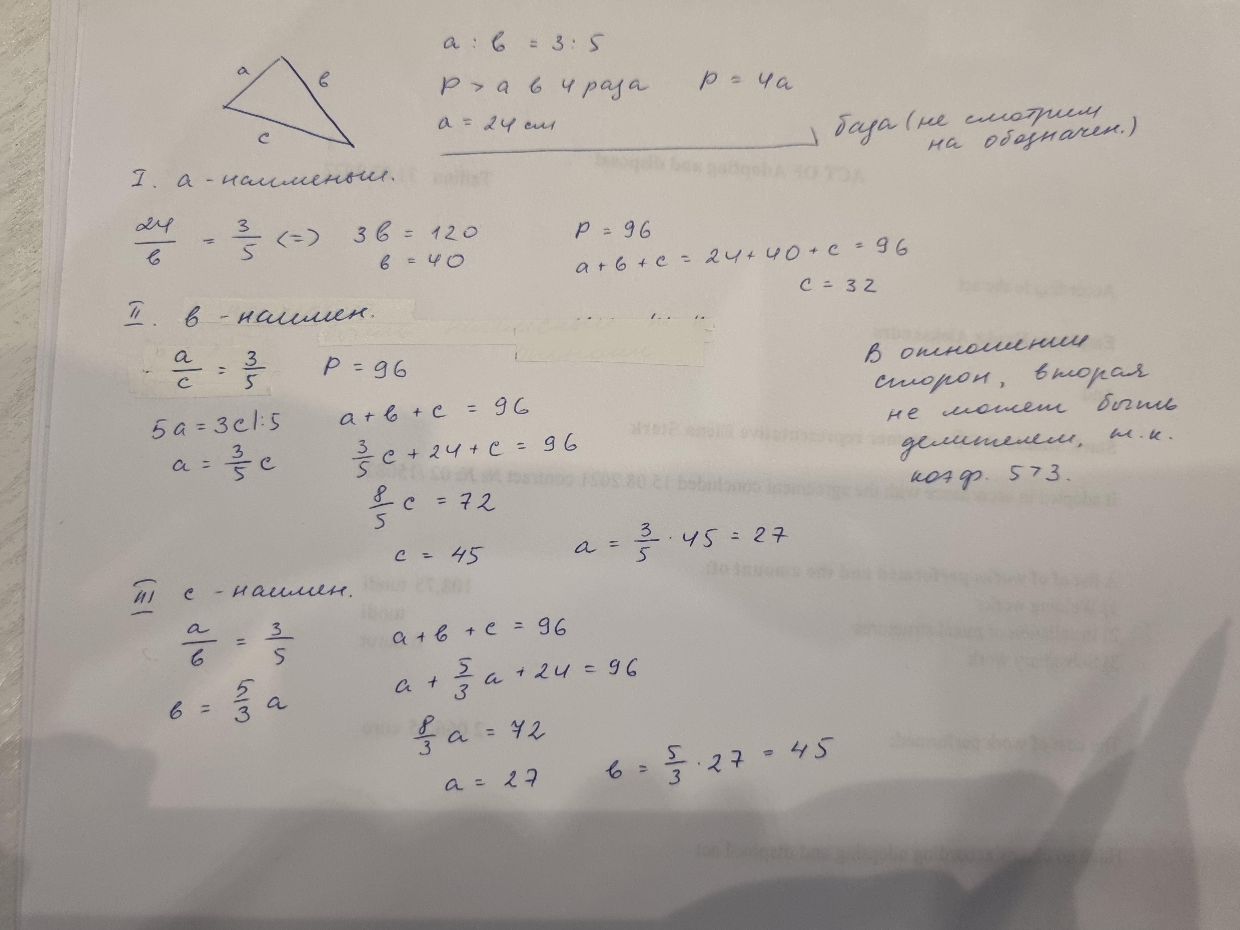 Две стороны некоторого треугольника относятся как 3:5, а периметр этого треугольника - в четыре раза больше наименьшей стороны, длина которой 24 см. Найди стороны этого треугольника. Рассмотри все возможные варианты. Решение объясни.