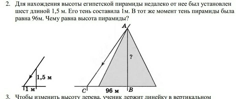 пропорция....если тень шеста была в Полтара раза меньше за его высоту, значит с пирамидой так же
