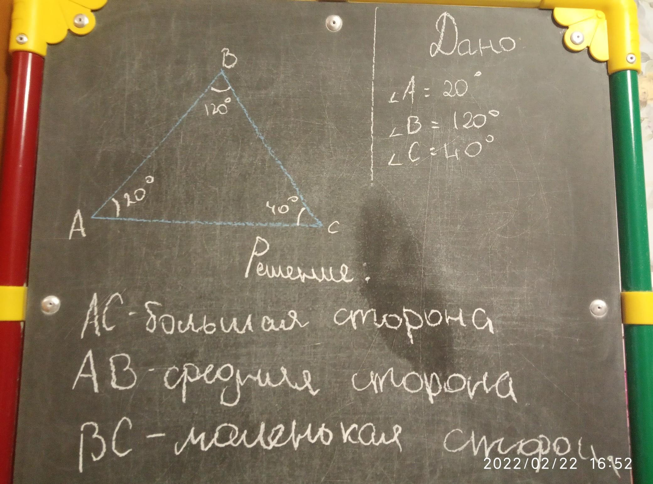 2. Дан треугольник АВС, где A = 20º <B = 120º <c= 40º. Используя теорему соотношениях между о сторонами и углами треугольника, определите большую сторону и вид треугольника. Сделайте вывод. Исходя из вывода, сделайте схематичный чертеж данного треугольника.