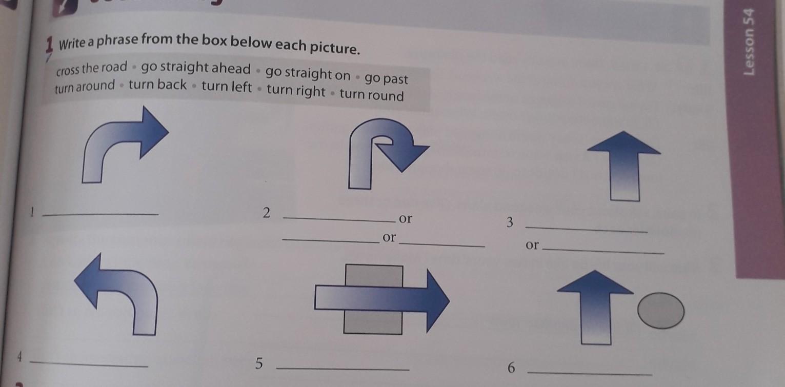Write a phrase from the box below each picture. cross the road go straight ahead.go straight on go past turn around turn back turn left turn right turn round Lesson 54 2 or 3 or or 5