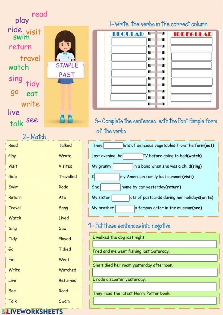 2.read-read(не изменяемый глагол), play-played, visit-visited, ride-rode, swim-swam, return-returned, travel-travelled, watch-watched, sing-sang, tidy-tidied, go-went, eat-ate, write-wrote, live-lived, see-saw, talk-talked.
