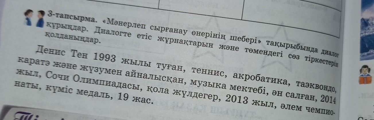 3-тапсырма. «Мәнерлеп сырғанау өнерінің шебері» тақырыбында диалог Rрыңдар. Диалогте етіс жұрнақтарын және төмендегі сөз тіркестерін қоданыңдар. Денис Тен 1993 жылы туған, теннис, акробатика, таэквондо, каратэ жəне жүзумен айналысқан, музыка мектебі, ән салған, 2014 жыл, Сочи Олимпиадасы, қола жүлдегер, 2013 жыл, әлем чемпио- наты, күміс медаль, 19 жас.