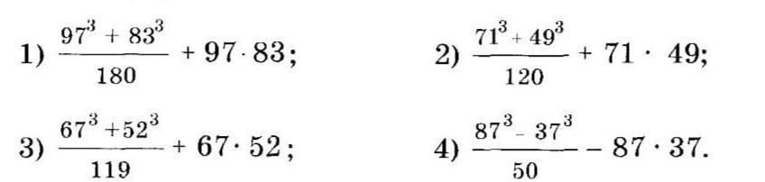 \displaystyle\bf\\1)\\\\\frac{97^{3} +83^{3} }{180} +97\cdot 83=\frac{(97+83)(97^{2}-97\cdot 83+83^{2} ) }{180} +97\cdot 83=\\\\\\=\frac{180\cdot(97^{2} -97\cdot 83+83^{2} )}{180} +97\cdot83=97^{2} -97\cdot 83+83^{2}+97\cdot 83=\\\\\\=97^{2} +83^{2} =16298\\\\\\2)\\\\\frac{71^{3} +49^{3} }{120} +71\cdot 49=\frac{(71+49)(71^{2}-71\cdot 49+49^{2} ) }{120} +71\cdot 49=\\\\\\=\frac{120\cdot(71^{2} -71\cdot 49+49^{2} )}{120} +71\cdot49=71^{2} -71\cdot 49+49^{2}+71\cdot 49=