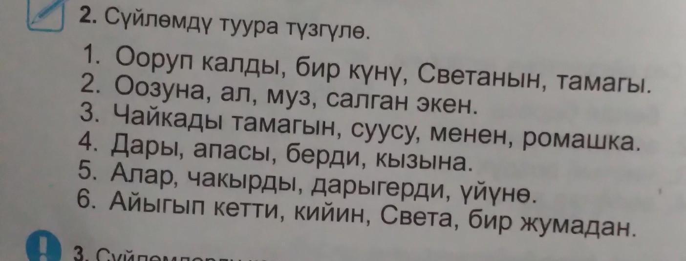 2. Сүйлөмдү туура түзгүлө. 1. Ооруп калды, бир күнү, Светанын, тамагы. 2. Оозуна, ал, муз, салган экен. 3. Чайкады тамагын, суусу, менен, ромашка, 4. Дары, апасы, берди, кызына, 5. Алар, чакырды, дарыгерди, үйүнө, 6. Айыгып кетти, кийин, Света, бир жумадан,Помогите пожалуйста. дам 60 баллов но толко помогите