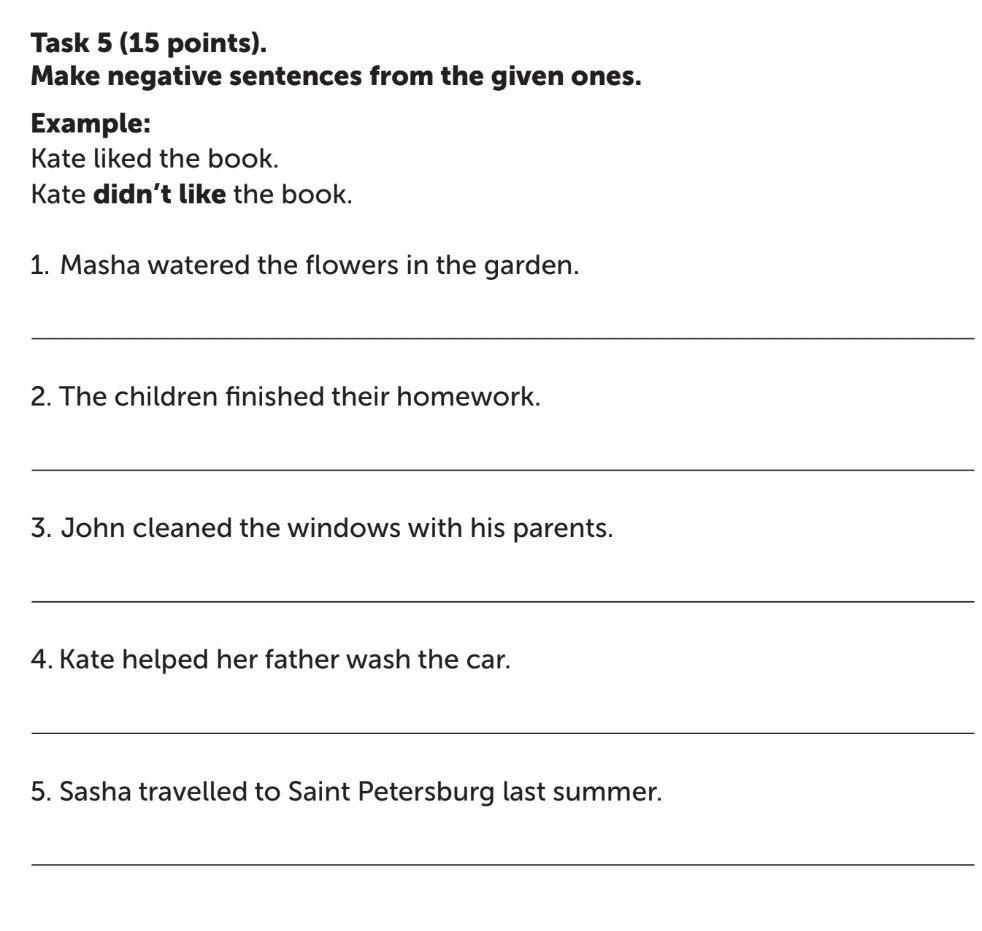 1.Masha didnt water the flowers in the garden.2.The children didnt finish their homework.3.John didnt clean the windows with his parents.4.Kate didnt help her father wash the car.5.Sasha didnt travel to Saint Peterburg last summer.