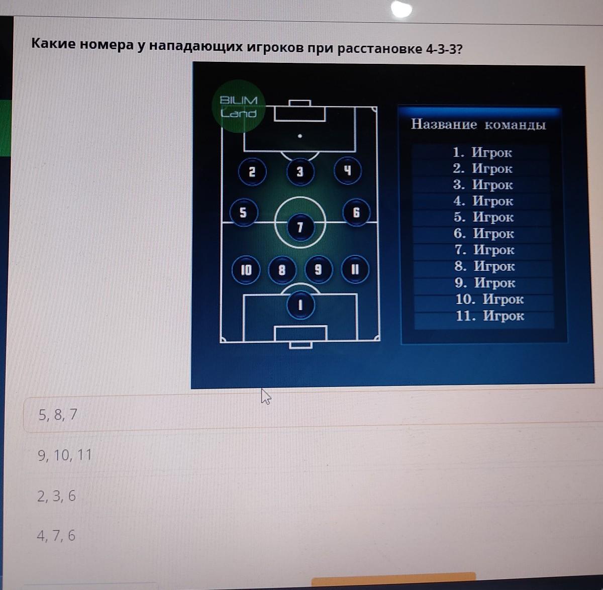 Какие номера у нападающих игроков при расстановке 4-3-3? BILM Land Название команды 2 э ч 5 1. Игрок 2. Игрок 3. Игрок 4. Игрок 5. Игрок 6. Игрок 7. Игрок 8. Игрок 9. Игрок 10. Игрок 11. Игрок ID 5,8,7 9, 10, 11 2, 3,6 4,7,6
