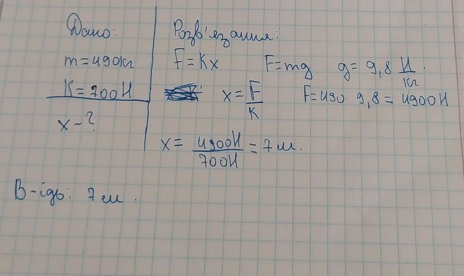 На тонкому дроті висить вантаж масою 490 кг. Визначте подовження дроту, якщо його жорсткість 700 Н/м.