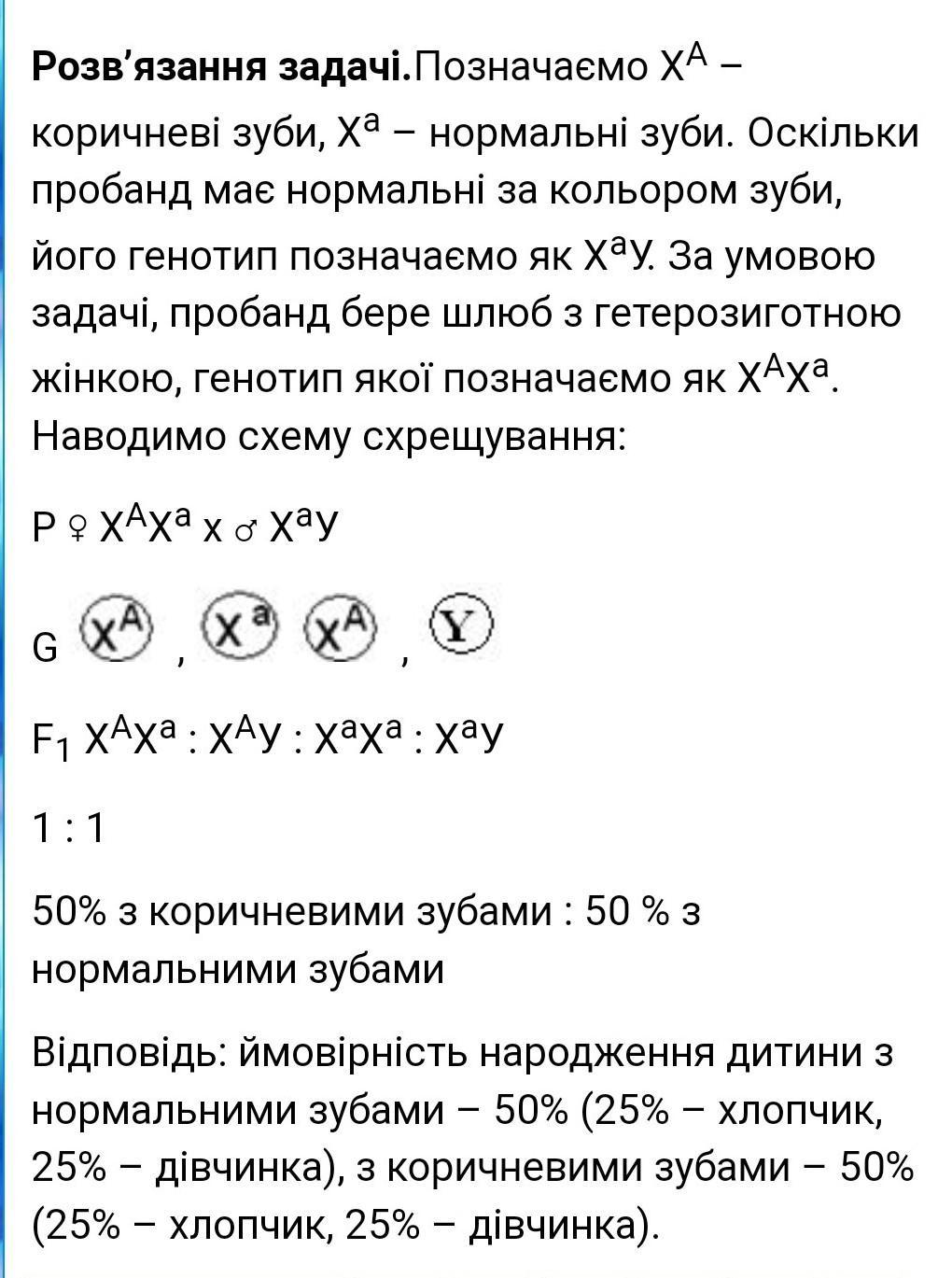 Пробанд має нормальні за забарвленням зуби. У його сестри зуби коричневі. У матері пробанда зуби коричневі, а у батька нормальне забарвлення. Сім сестер матері пробанда з коричневими зубами; а чотири брати – з нормальними. Одна тітка пробанда по лінії матері, яка мала коричневі зуби, вийшла заміж за чоловіка з нормальними зубами. У них троє дітей: дочка і син з коричневими зубами і дочка з нормальними. Два дядьки пробанда по лінії матері одружені з жінками без аномалії в забарвленні зубів. У одного з них два сини і дочка, у іншого – дві дочки і син. Всі вони з нормальними зубами. Коричневі зуби мав дід пробанда по лінії матері, а бабуся по лінії матері мала нормальні зуби. Два брати діда по лінії матері з нормальним забарвленням зубів. Прабабка (матір діда по лінії по лінії матері) і прапрабабка (матір цієї прабабки) мали коричневі зуби, а їхні чоловіки були з нормальним забарвленням зубів. Визначити, які діти можуть бути у пробанда, якщо він вступить у шлюб з жінкою, гетерозиготною за цією ознакою.