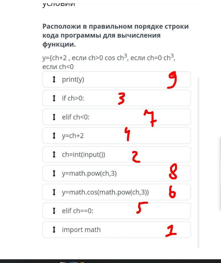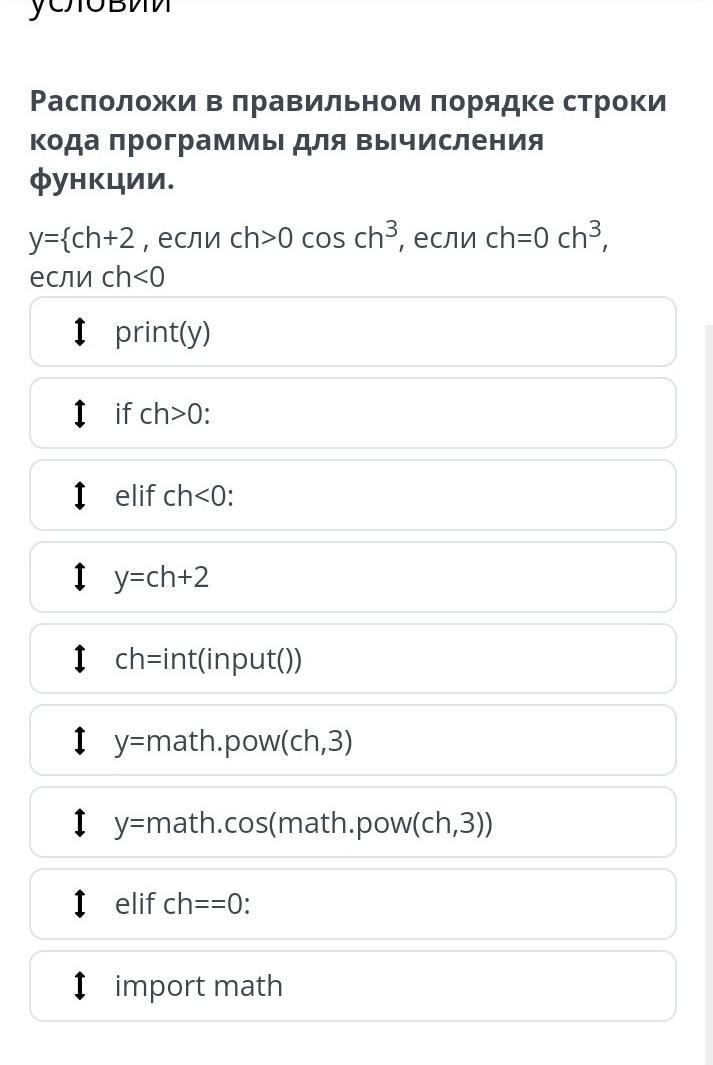 Расположи в правильном порядке строки кода программы для вычисления функции. у={ch+2, если сh>0 cos ch3, если сh=0 ch3, если сh0: 1 elif ch