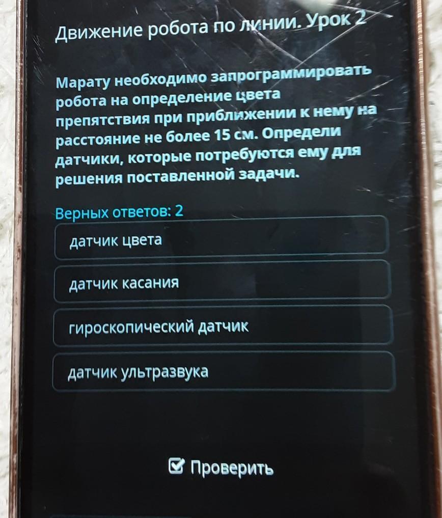 Движение робота по ЛИНИИ. Урок 2 Марату необходимо запрограммировать робота на определение цвета препятствия при приближении к нему на расстояние не более 15 см. Определи датчики, которые потребуются ему для решения поставленной задачи. Верных ответов: 2 датчик цвета датчик касания гироскопический датчик датчик ультразвука ГОСПАДИ ПРОШУ ТОЛЬКО ПРАВИЛЬНО У МЕНЯ 3 ПРАВИЛЬНЫХ ВСЕГО а это 9 последний вопрос..