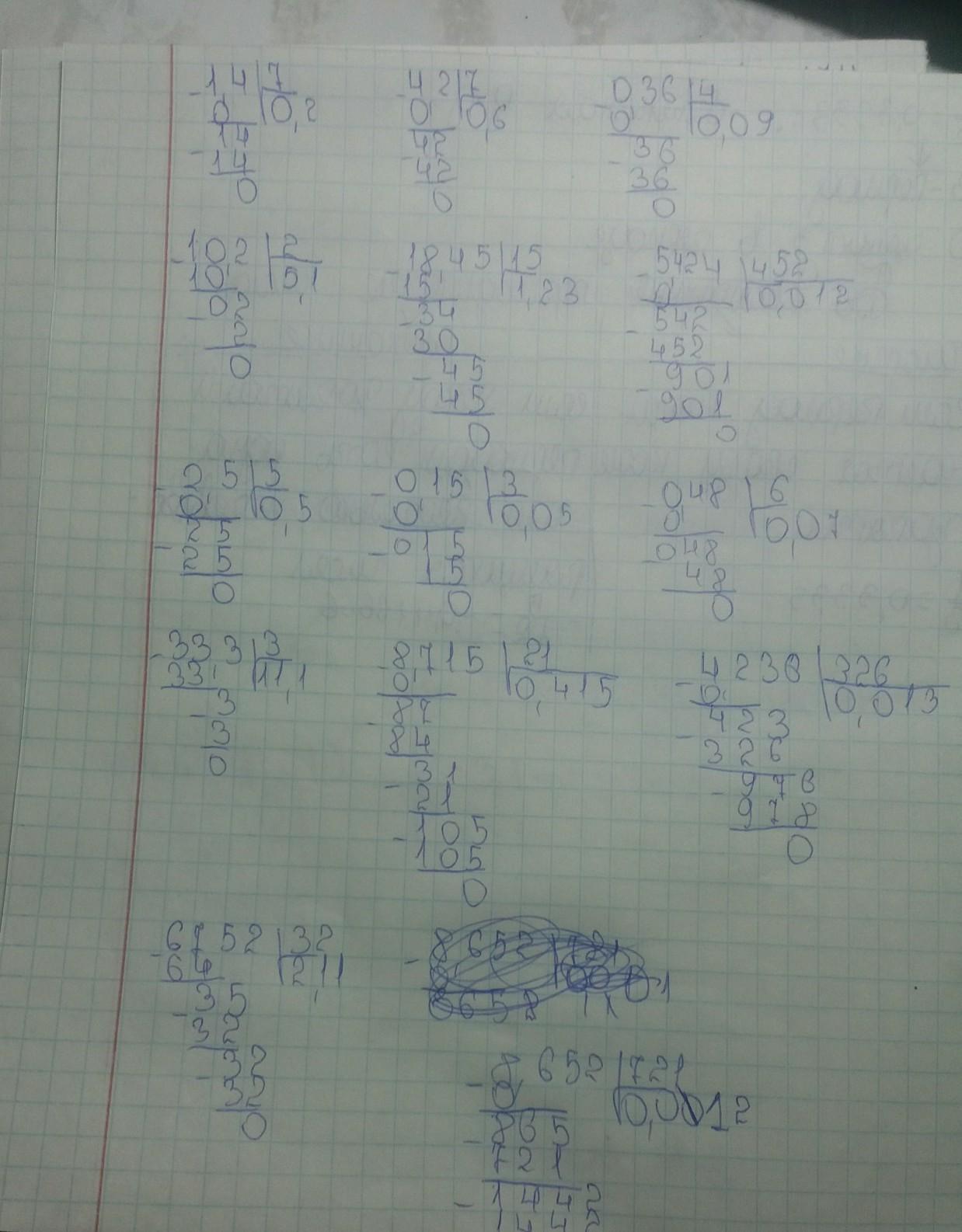 686. Вычислите: 1) 1,4 : 7; 4) 4,2 : 7; 7) 0,36 : 4; 10) 10,2 : 2; 13) 18,45 : 15; 16) 5,424 : 452; 2) 2,5 : 5; 5) 0,15 : 3; 8) 0,48 : 6; 11) 33,3 : 3; 14) 8,715 : 21; 17) 4,238 : 326; 3) 2,7:9; 6) 0,24 :8; 9) 0,63:9; 12) 44,8: 2; 15) 67,52 : 32; 18) 8,652 : 721. в столбик