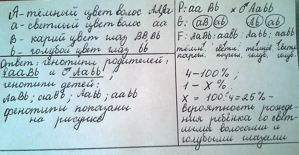 Ребят,помогите. Задача по генетики. Тёмный цвет волос у человека доминирует над светлым цветом,а карий цвет глаз- над голубым. Определите генотипы родителей,генотипы и фенотипы детей,родившихся от брака гетерозиготного темноволосого голубоглазого мужчины и гетерозиготной кареглазой светловолосой женщины. Составьте схему решения задачи.Какова вероятность рождения в этой семье голубоглазого светловолосого ребёнка?