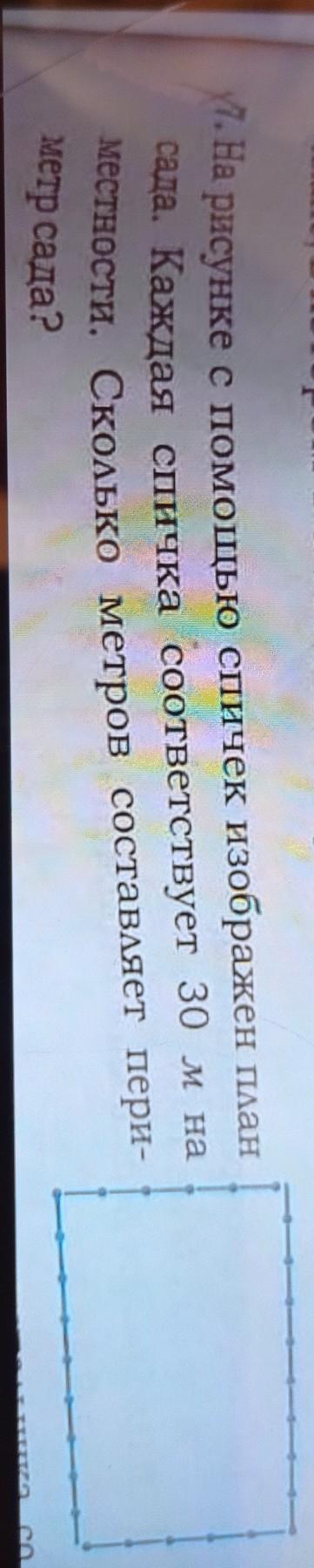 7. На рисунке с помощью спичек изображен план сада. Каждая спичка соответствует 30 м на местности. Сколько метров составляет пери- метр сада?