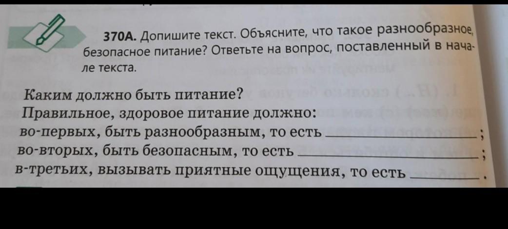 370А. Допишите текст Объясните, что такое разнообразное, безопасное питание? Ответьте на вопрос, поставленный в нача де текста во-первых, быть разнообразным, то есть во-вторых, быть безопасным, то есть В-третьих, вызывать приятные ощущения, то есть Правильное, здоровое питание должно: Каким должно быть питание?ПОМОГИ ПОЖАЛУЙСТА ЕСЛИ НЕ ПОМОЖЕТЕ ТО МНЕ ХАНА.ПЛИЗЗ ТОЛЬКО ПРАВИЛЬНОЕ