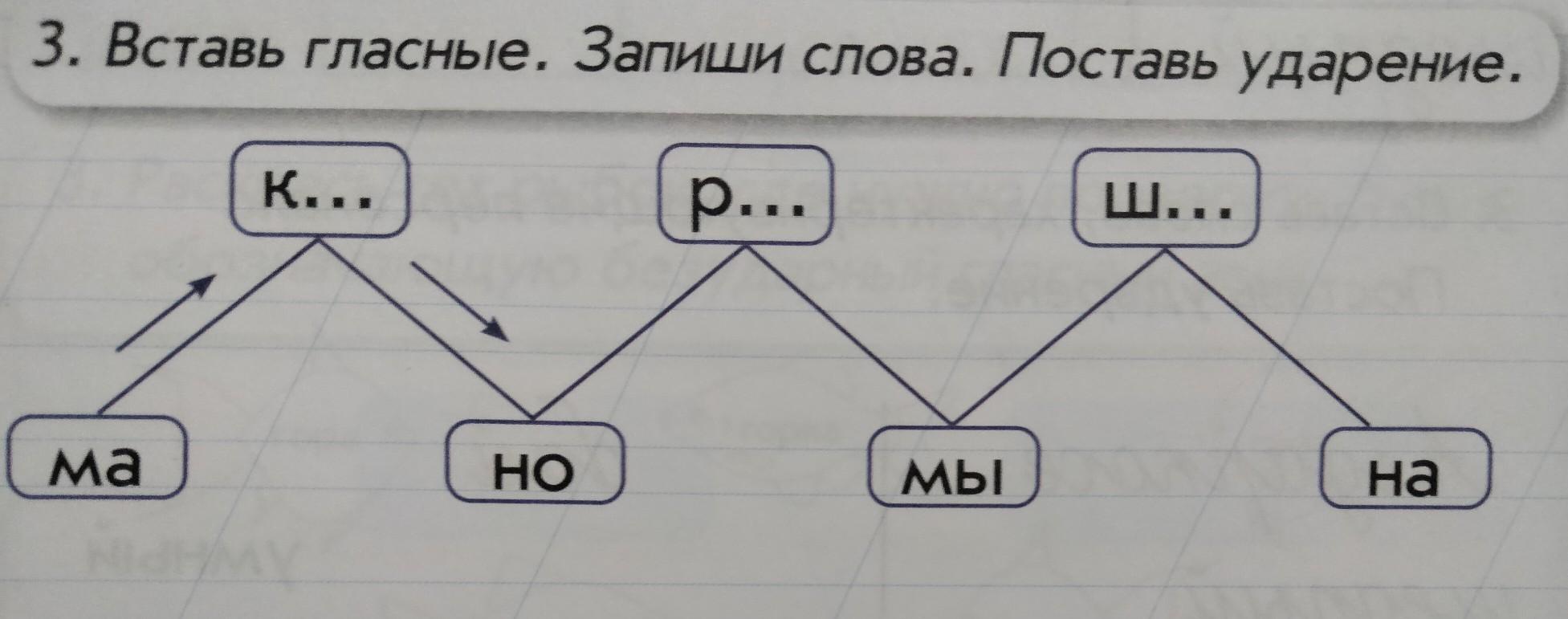 3. Вставь гласные. Запиши слова. Поставь ударение. к... р... Ш. .. ма НО Mbi На