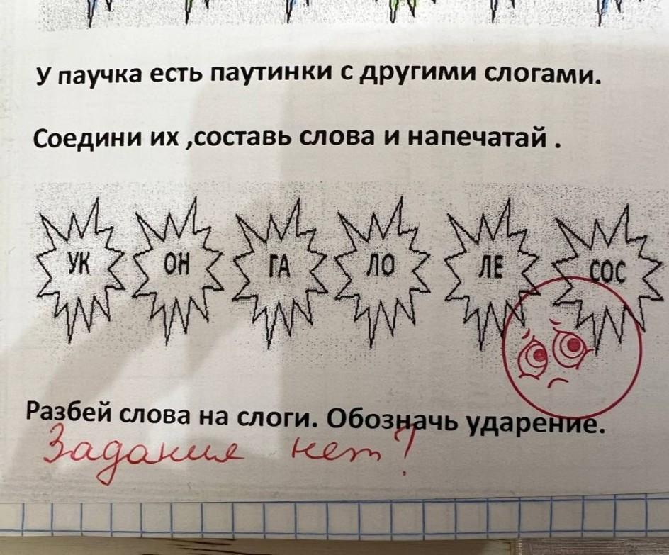 Смотри , там говорится что у паучка есть паутинки , со слогами .И ты должен помочь ему составить из этих паутинок - слогов слова .Стоп! Кажется у тебя выше есть ещё какие то слоги , и ты их , должен соединить с этими