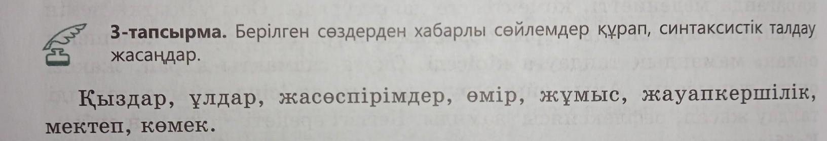 Қажет етеді (не iстейдi?) баяндауыш, өмір суру (не?) бастауыш, жауапкершілікті (нені?) толықтауыш, үлкен (қандай?) анықтауыш.