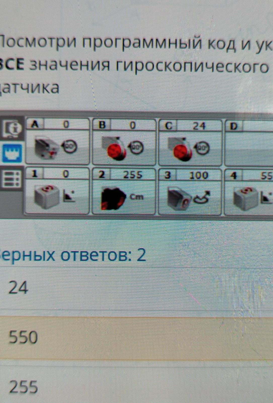 Посмотри программный код и укажи ВСЕ значения гироскопического датчика A C 24. D EV3 2 255 100 EN Bos Верных ответов: 2 24 550 255