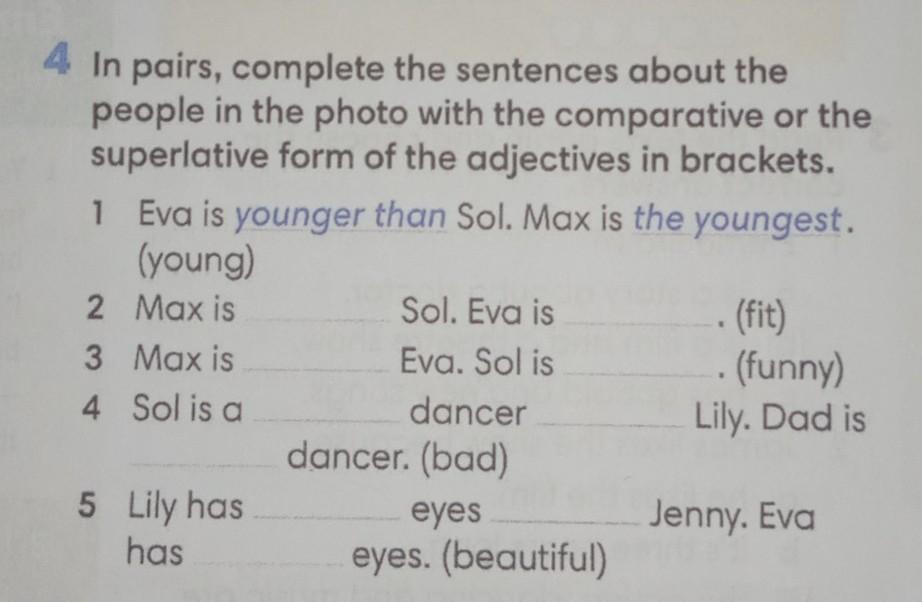 5)Lily has more beautiful eyes than Jenny. Eva has the most beautiful eyes.