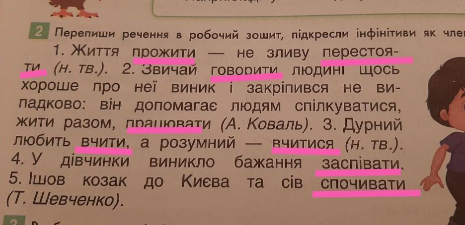 Ответ: рожевими паличками підкреслено то, що треба підкреслити двома рисками, тобто інфінітиви