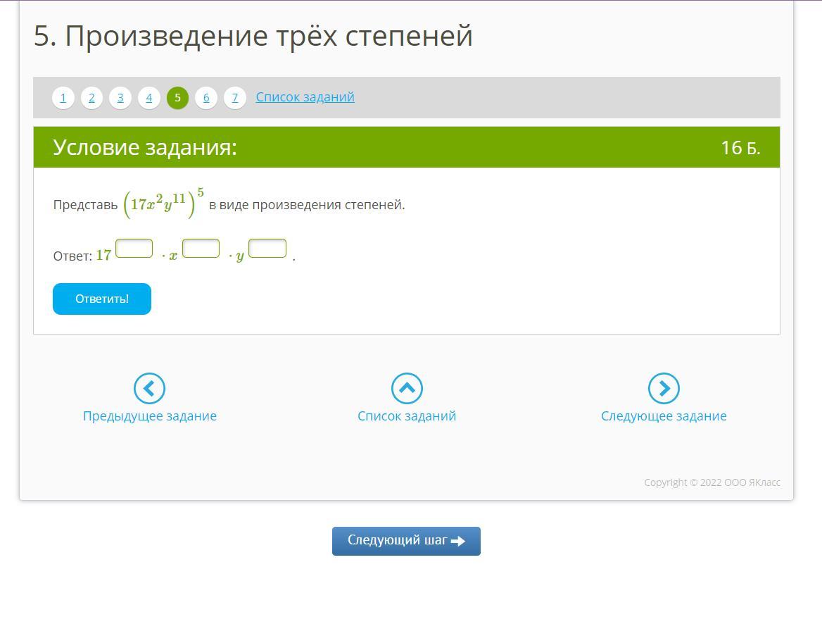 (17х²у¹¹)⁵ = 17⁵х¹⁰у⁵⁵