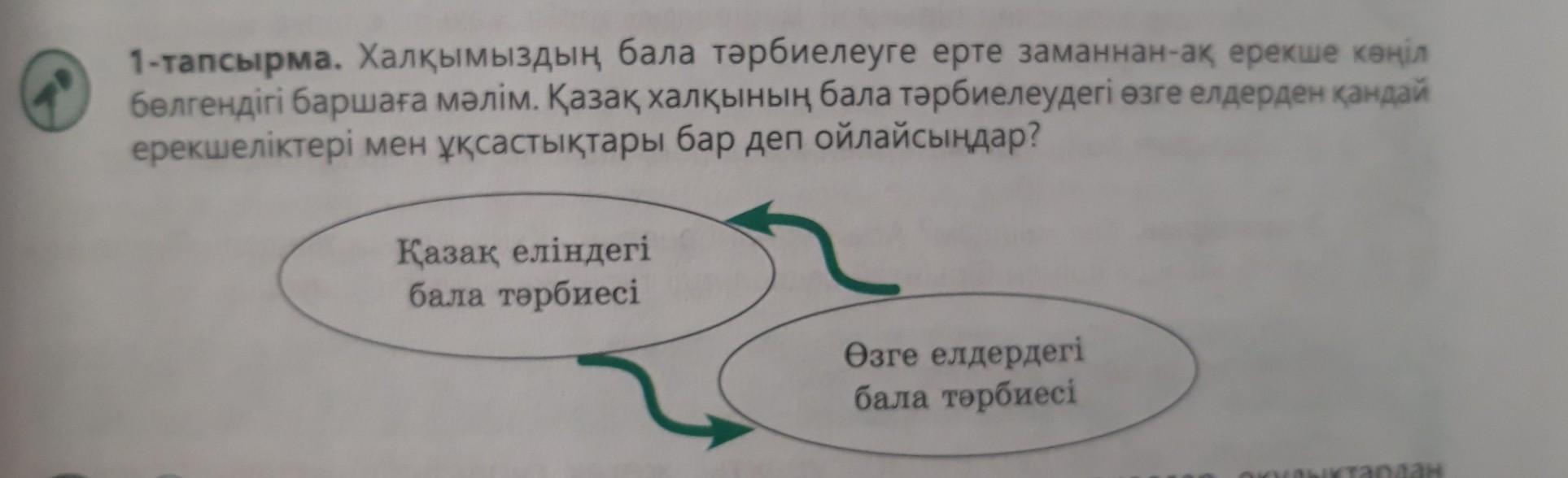 1-тапсырма. Халқымыздың бала тәрбиелеуге ерте заманнан-ак ерекше көңіл бөлгендігі баршаға мәлім. Қазақ халқының бала тәрбиелеудегi өзге елдерден кандай ерекшеліктері мен ұқсастықтары бар деп ойлайсыңдар?Өзге елдердегi бала тәрбиесi Қазақ еліндегі бала тәрбиесі