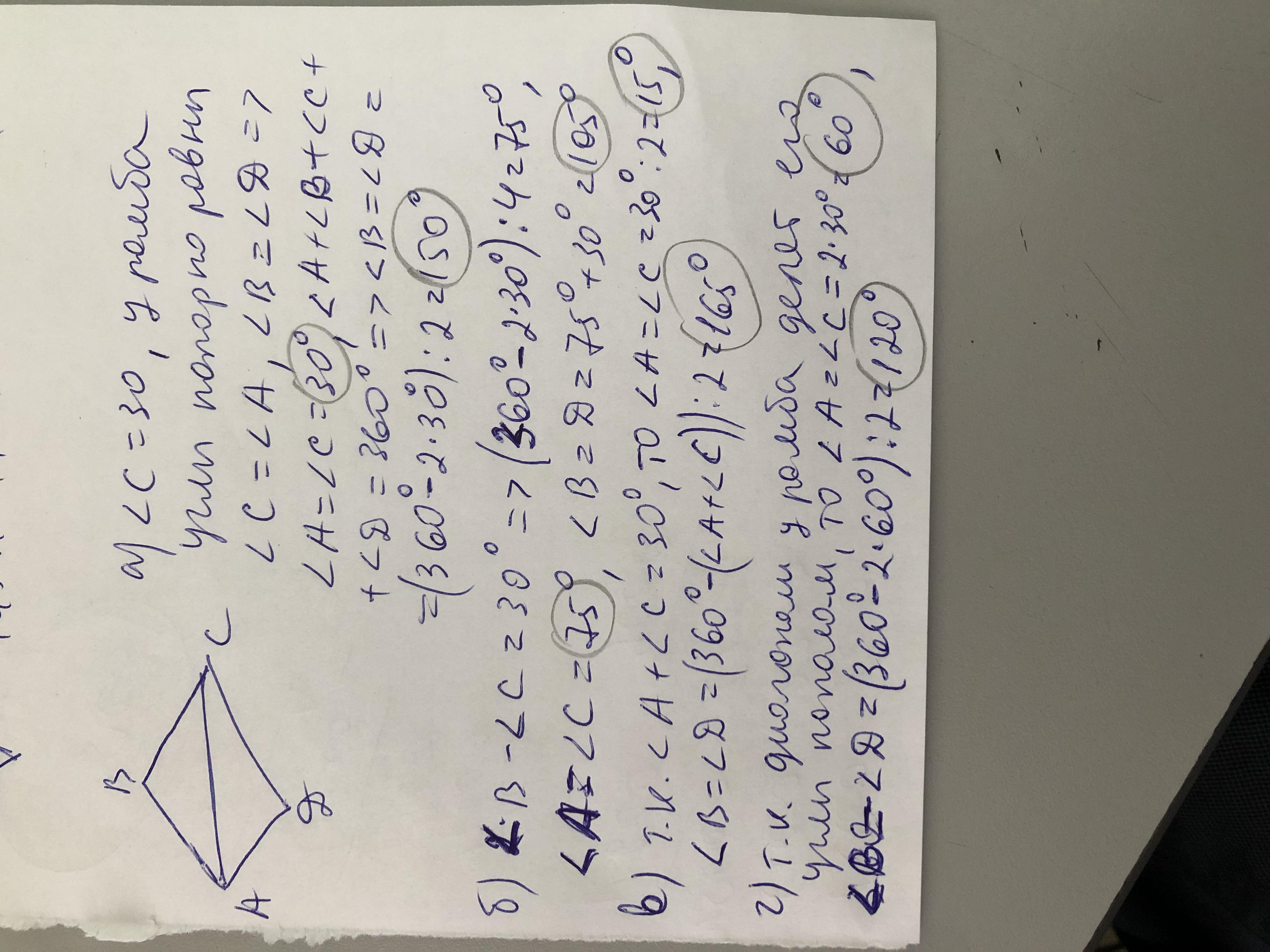 Вычислите ромбовидные петли, если (а) один угол равен 30°; б) разница между двумя углами 30°; в) сумма двух углов равна 30°; г) угол, образованный одним ребром по диагонали, равен 30°!
