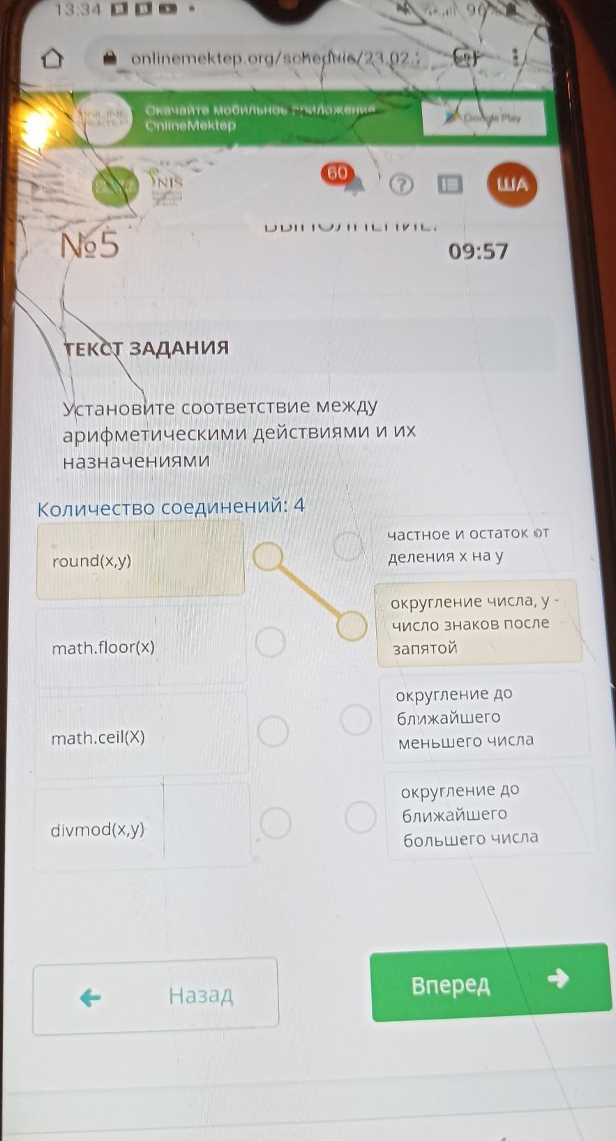 Установите соответствие между арифметическими действиями и их назначениями Количество соединений: 4 Частное и остатокот делениях на у roundixy округление числа, у число знаков После запятой math floor(x) округление до ближайшего меньшего числа math ceil(X) округление до ближайшего большего числа divmod(x, y)