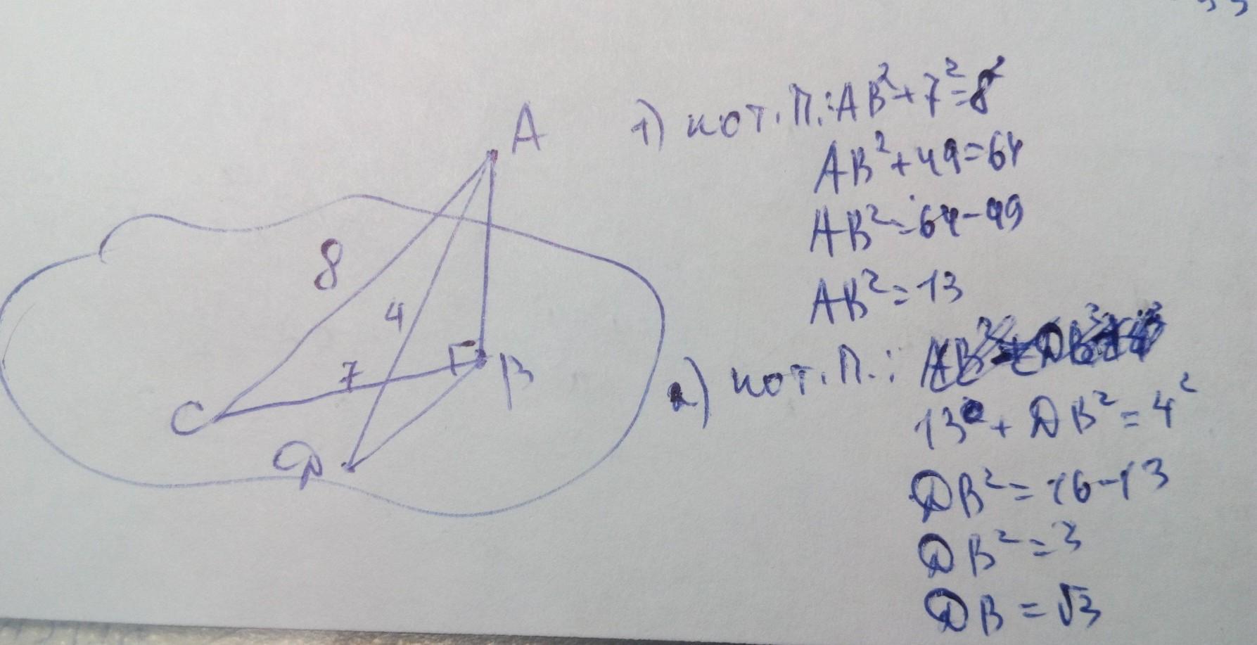 Дано: AB _|_а, наклонная АС=15, её проекция на плоскость а равна 9, наклонная AD=13. Найти: перпендикуляр AB и проекцию AD на плоскость а ( альфа)