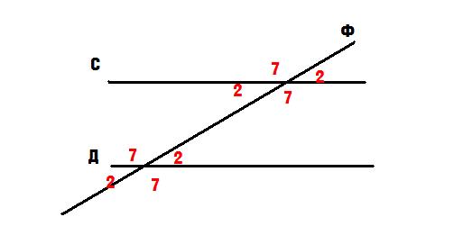 №1 Найдите все углы , образовавшиеся при пересечении двух параллельных прямых c и d секущей f, если два из них относятся как 2:7