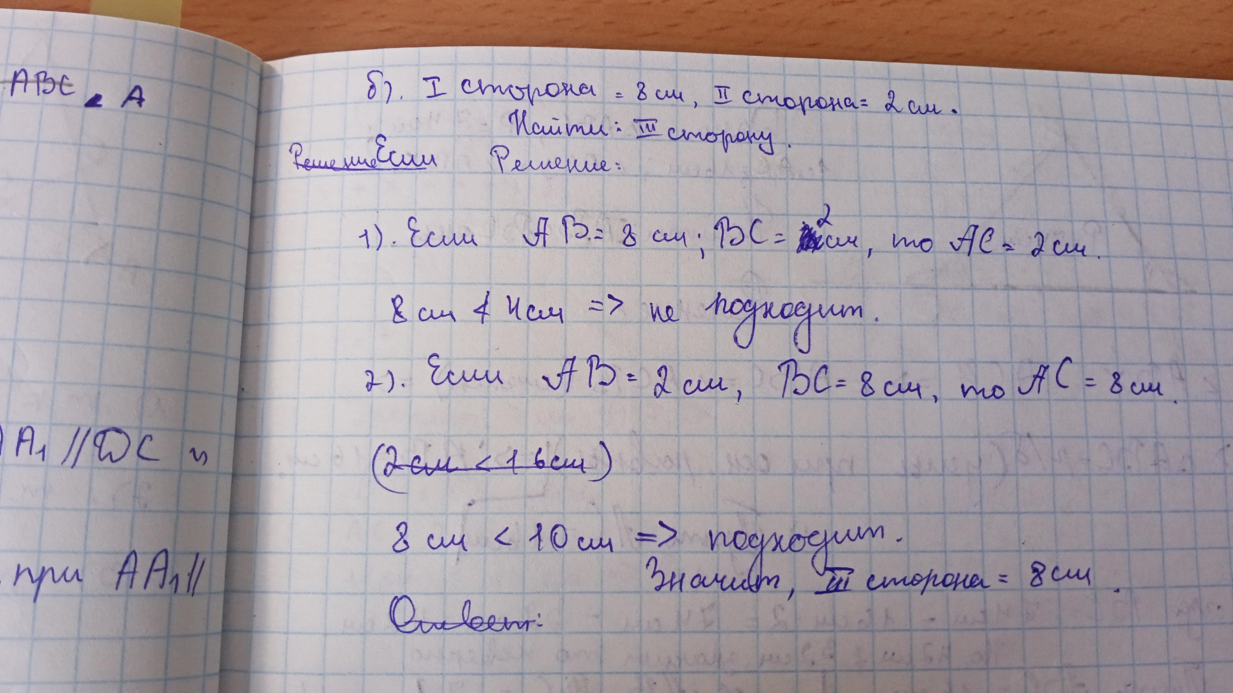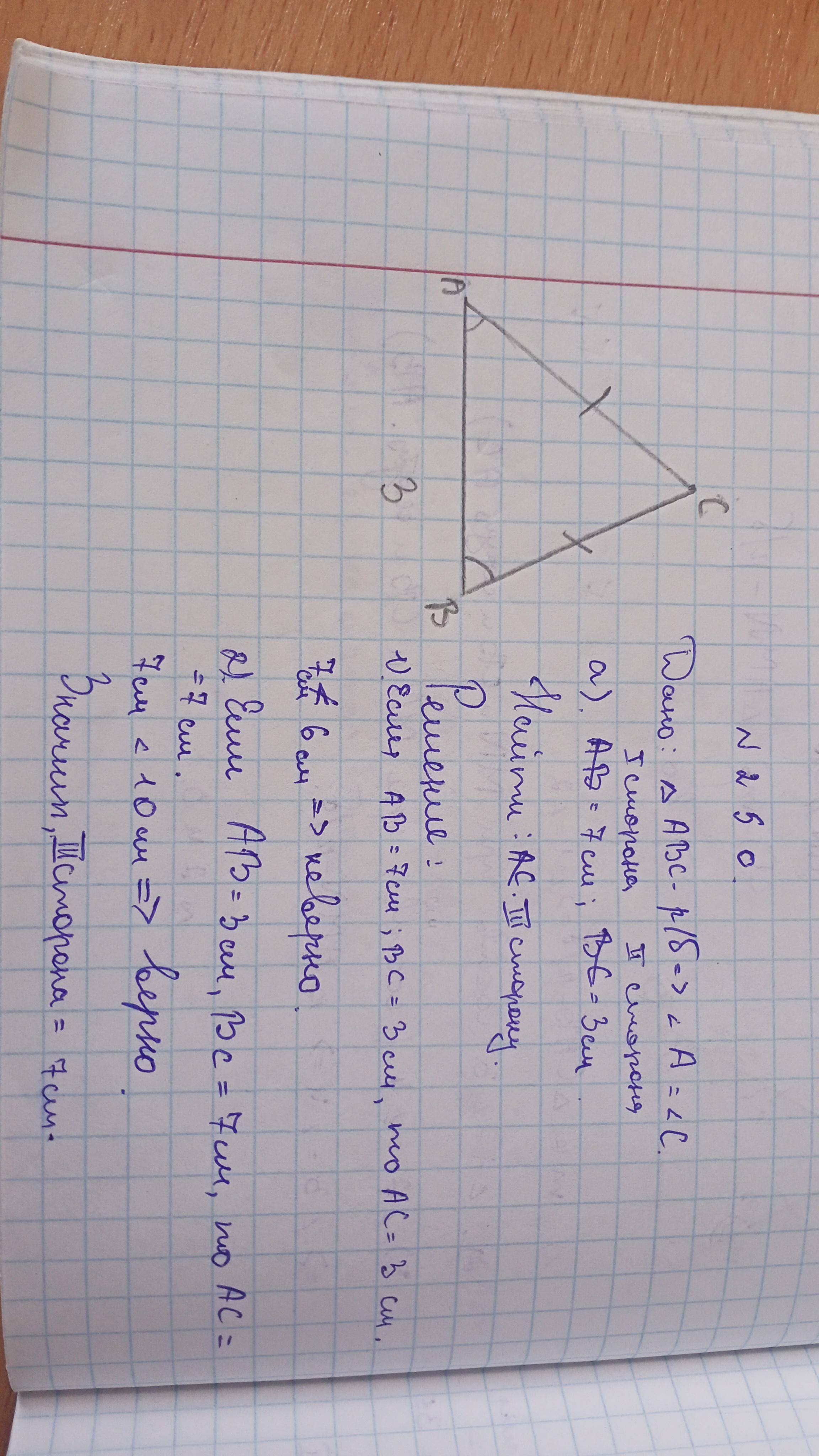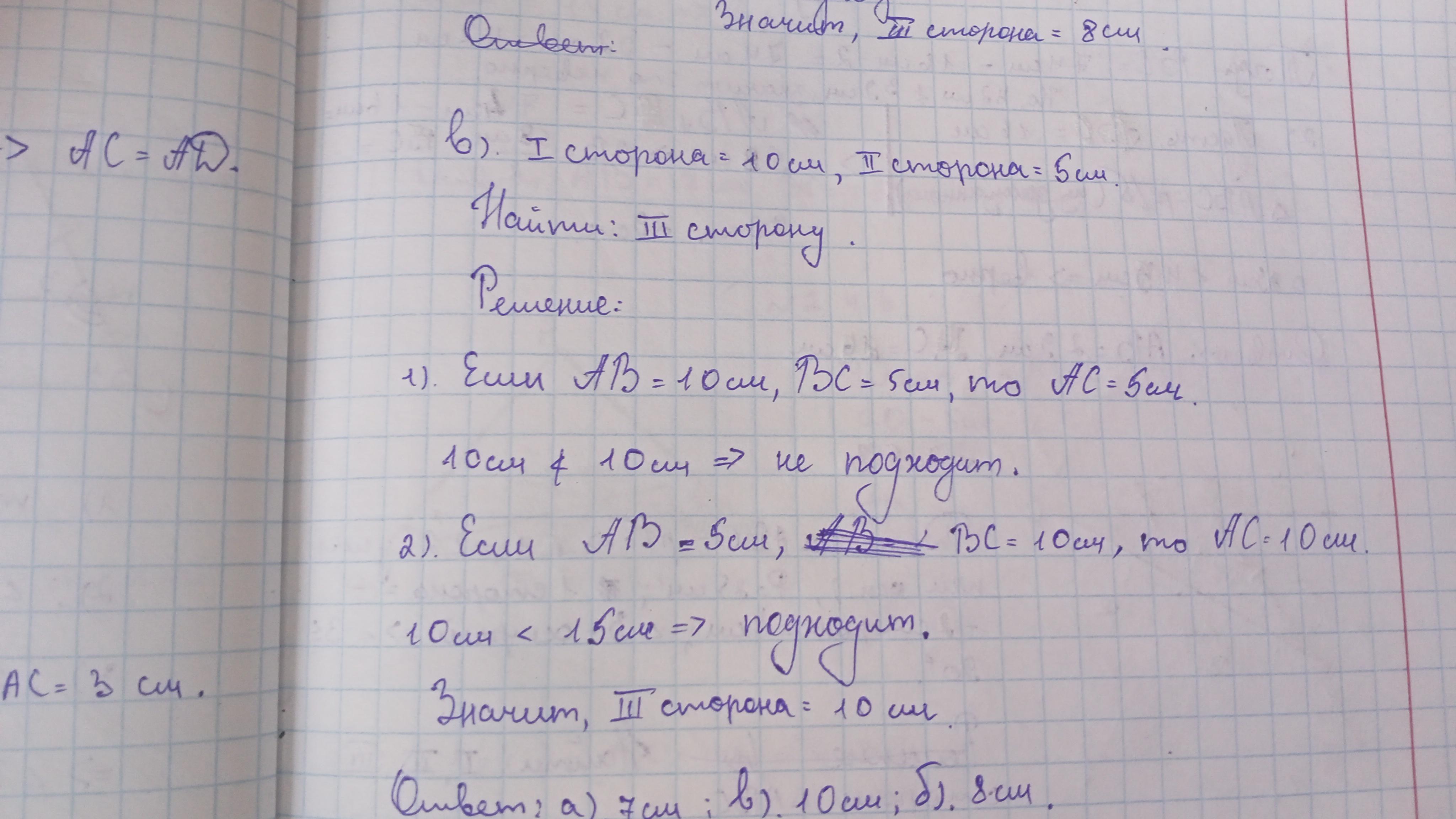 250. Найдите сторону равнобедренного треугольника, если две другие стороны равны: а) 5 см и 3 см; б) 8 см и 2 см; в) 10 см и 5 см.