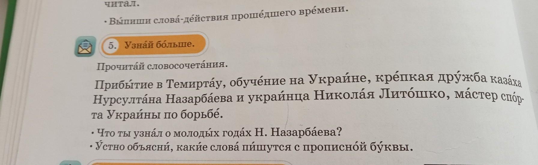 5. Узнай больше. Прочитай словосочетания. Прибытие в Темиртау, обучение на Украйне, крепкая дружба казаха Нурсултана Назарбаева и украйнца Николая Литошко, мастер спор та Украйны по борьбе. • Что ты узнал о молодых годах Н. Назарбаева? • Ўстно объясни, какие слова пишутся с прописной буквы.