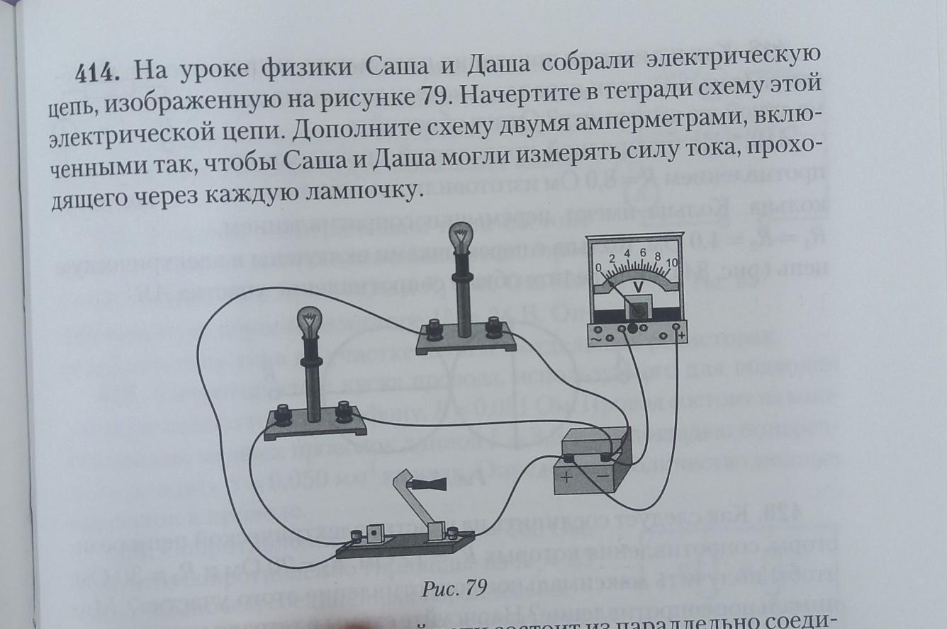 на уроке саша и даша собрали электрическую цепь изображеную на рисунке 79 начертите схему этой электрической цепи дополнив её двумя амперметрами чтобы Саша и даша могли измерять силу тока проходящего через каждую лампочку