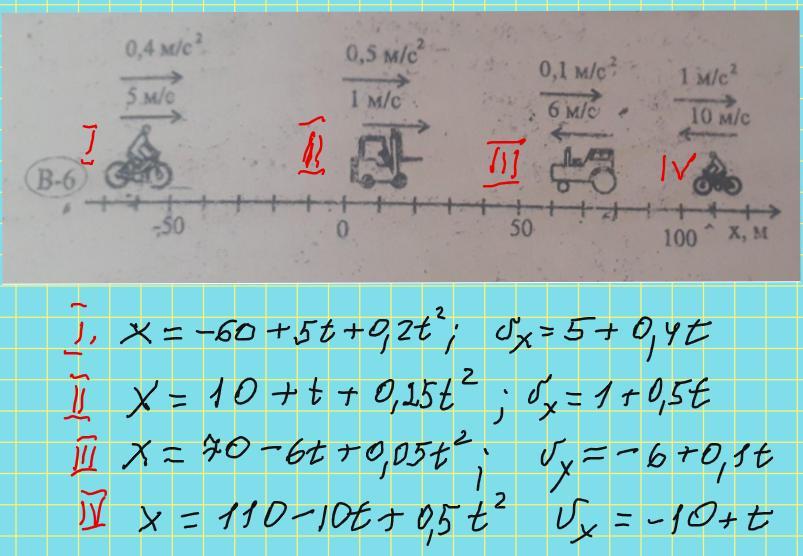на малюнках показані положення, швидкості та прискорення тіл у даний час.записати для кожного тіла рівняння залежності від часу координати та проекції швидкості (в CI) , вважаючи рух рівноприскореним УМОЛЯЮ