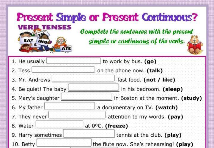 ОООООЧЕНЬ НУЖНА ПОМОЩЬ!(английский)Нужно поставить глагол в правильной форме,и определить это present simpe или present continuous по "словам помощникам")Всем буду очень благодарна за помощь.