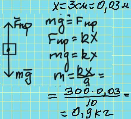 До дружини підвісили вантаж при цьому дружина видовжилася на 3 см.Якою є маса вантажа,якщо жорсткість дружини 300 Н/м? g=10 Н/кг