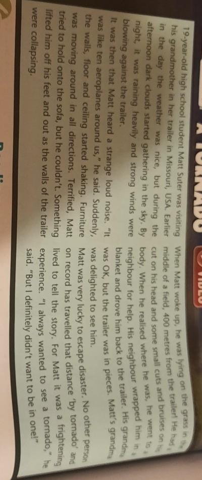 7.15 7.R2 2. Read the text again and mark sentences T(true), F (false) or DS (doesn't say). (1.6 7 Matt Suter lived with his grandmother in a trailer. 2 It was raining all day before the tornado hit. 3 Passing planes made the trailer shake. 4 Matt hit his head when he landed in the field. 5 Matt escaped the tornado with minor injuries. 6 Matt's grandmother thought he was dead.