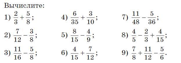 Ответ:1)31/24 2 )5/24 3)1/16 4) 30/70 5) 4/45 6)51/60 7)13/144 8)12/30 9)23/44
