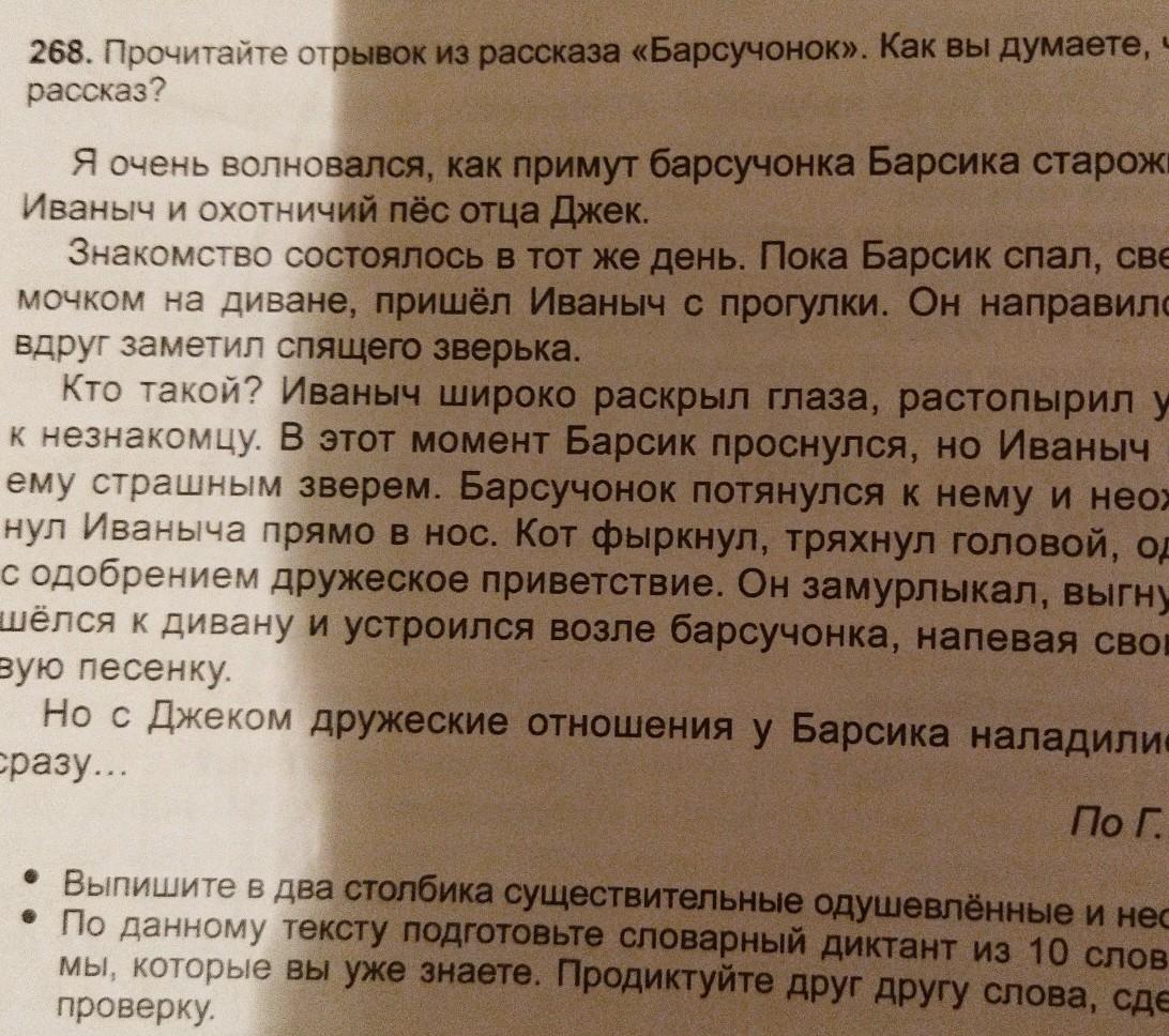 268. Прочитайте отрывок из рассказа «Барсучонок». Как вы думаете, чем закончился рассказ? Я очень волновался, как примут барсучонка Барсика старожилы дома: кот Иваныч и охотничий пёс отца Джек. Знакомство состоялось в тот же день. Пока Барсик спал, свернувшись ко- мочком на диване, пришёл Иваныч с прогулки. Он направился к дивану и вдруг заметил спящего зверька. Кто такой? Иваныч широко раскрыл глаза, растопырил уши и шагнул к незнакомцу. В этот момент Барсик проснулся, но Иваныч не показался ему страшным зверем. Барсучонок потянулся к нему и неожиданно лиз- нул Иваныча прямо в нос. Кот фыркнул, тряхнул головой, однако принял с одобрением дружеское приветствие. Он замурлыкал, выгнул спину, про- шёлся к дивану и устроился возле барсучонка, напевая свою неторопли- вую песенку. Но с Джеком дружеские отношения у Барсика наладились далеко не сразу... По Г. Скребицкому • Выпишите в два столбика существительные одушевлённые и неодушевлённые. • По данному тексту подготовьте словарный диктант из 10 слов на орфограм- мы, которые вы уже знаете. Продиктуйте друг другу слова, сделайте взаимо- проверку.