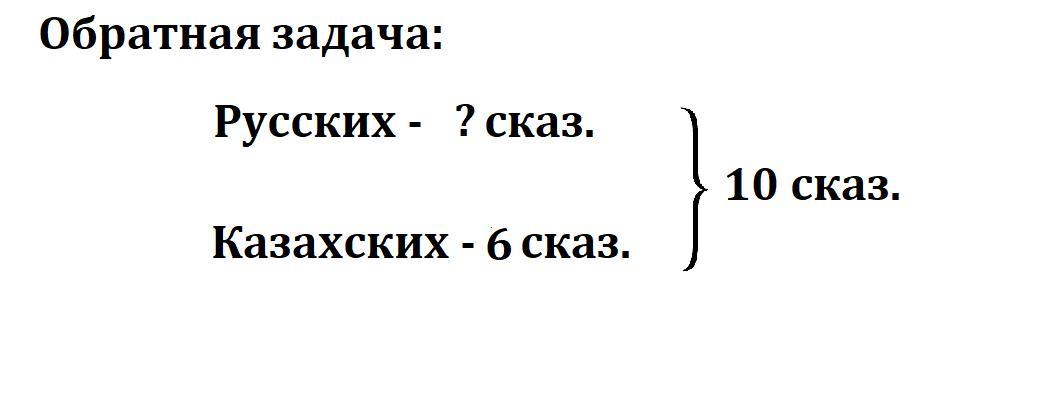 Обратная задача: Арман прочитал 10 народных сказок. Из них 6 казахских, а остальные - русские. Сколько русских народных сказок он прочитал?