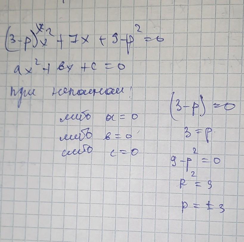 При каких значениях р уравнение (3 - р)x² + 7х + 9 -p² = 0 будет неполным квадратным уравнение?
