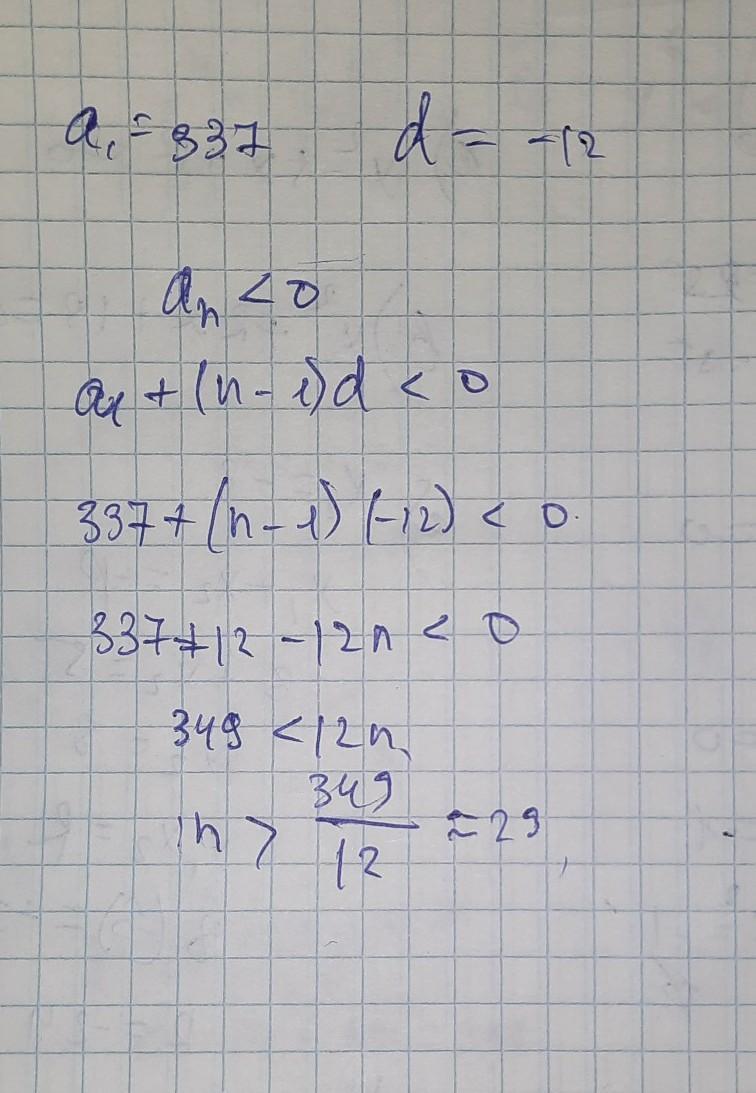 Дана арифметическая прогрессия A1 = 337, d = - 12. Найди значение первого отрицательного члена прогрессии