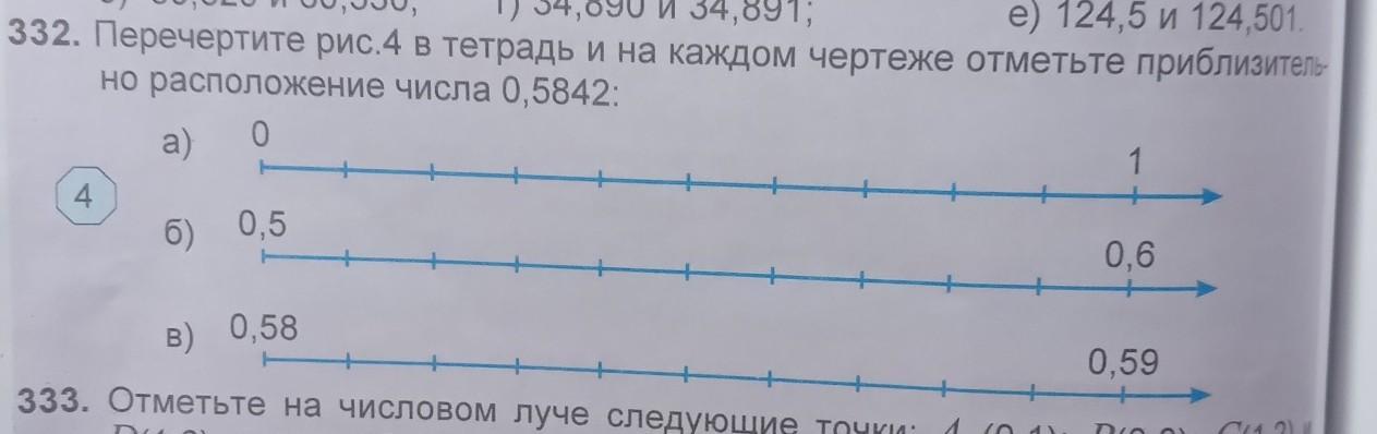 332. Перечертите рис. 4 в тетрадь и на каждом чертеже отметьте приблизитель но расположение числа 0.5842