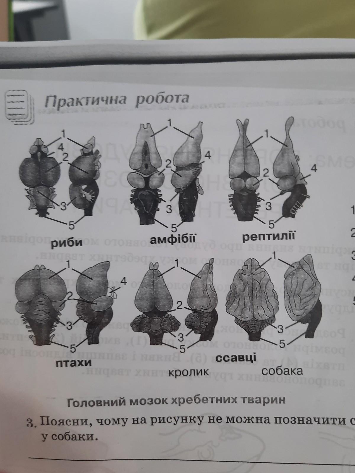 Роздивись рисунок будови головного мозку груп хребетних тварин, на яких відділи позначено цифрами. Зроби підпис до рисунка.
