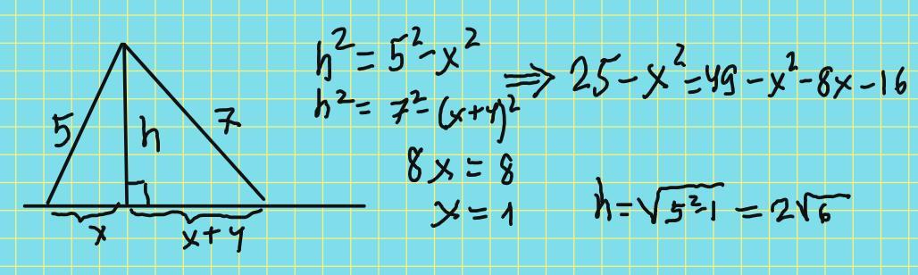 З точки до прямоï проведено дві похилі, довжини яких дорівнюють 5 см і 7 см, а різниця їх проекцiй на цю пряму 4 см. Знайдіть відстань від точки до даноï прямої.