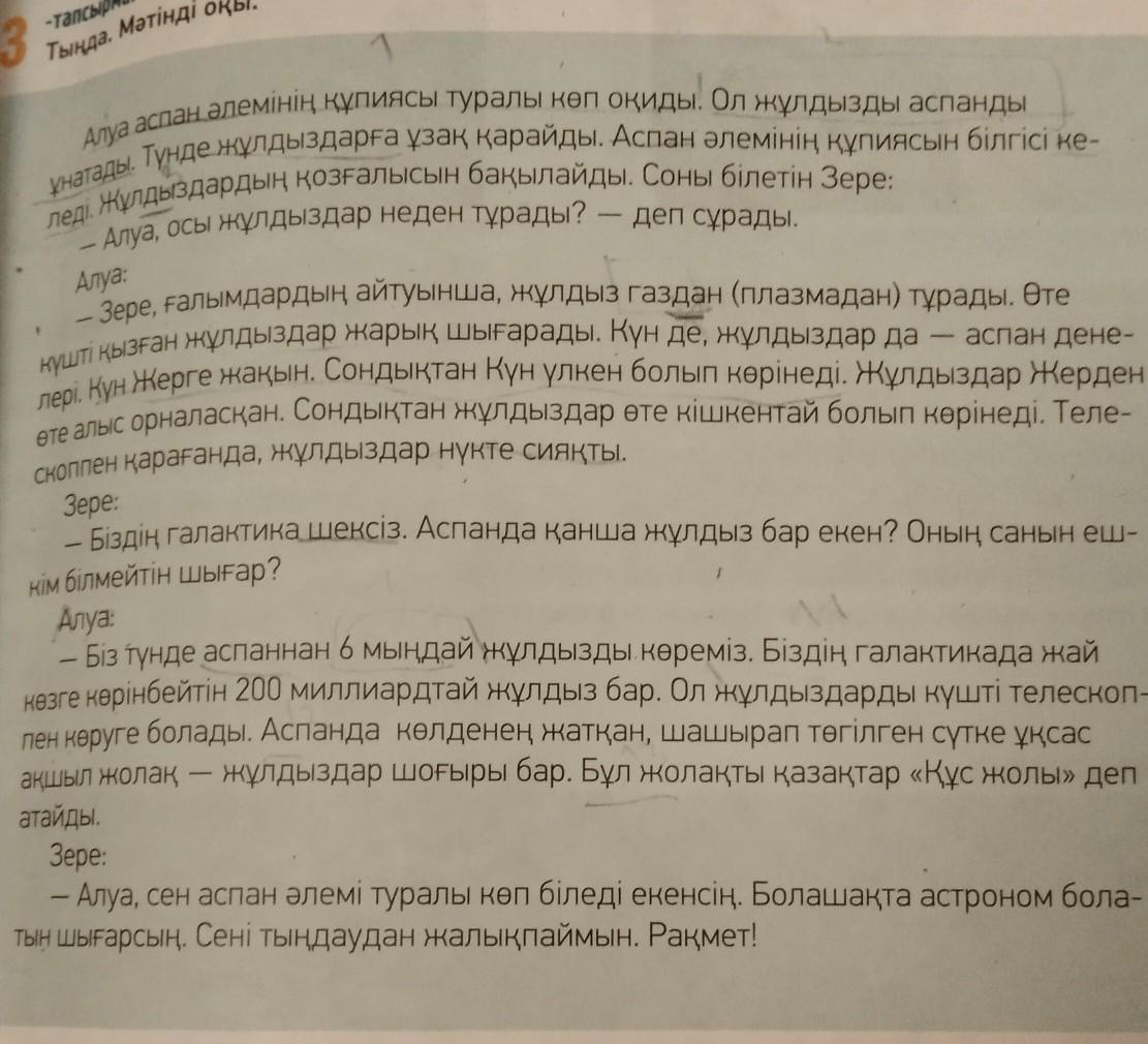 Алуа аспан әлемінің құпиясы туралы көп оқиды. Ол жұлдызды аспанды ұнатады. Түнде жұлдыздарға ұзақ қарайды. Аспан әлемінің құпиясын білгісі ке- леді. Жұлдыздардың қозғалысын бақылайды. Соны білетін Зере: Алуа, осы жұлдыздар неден тұрады? – деп сұрады. Алуа: - Зере, ғалымдардың айтуынша, жұлдыз газдан (плазмадан) тұрады. Өте күшті қызған жұлдыздар жарық шығарады. Күн де, жұлдыздар да – аспан дене- лері. Күн Жерге жақын. Сондықтан Күн үлкен болып көрінеді. Жұлдыздар жерден ете алыс орналасқан. Сондықтан жұлдыздар өте кішкентай болып көрінеді. Теле- скоппен қарағанда, жұлдыздар нүкте сияқты. Зере: Біздің галактика шексіз. Аспанда қанша жұлдыз бар екен? Оның санын еш- кім білмейтін шығар? Алуа: – Біз түнде аспаннан 6 мыңдай жұлдызды көреміз. Біздің галактикада жай кезге көрінбейтін 200 миллиардтай жұлдыз бар. Ол жұлдыздарды күшті телескоп- пен көруге болады. Аспанда көлденең жатқан, шашырап төгілген сүтке ұқсас аңшыл жолақ - жұлдыздар шоғыры бар. Бұл жолақты қазақтар «Құс жолы» деп атайды. Зере: - Алуа, сен аспан әлемі туралы көп біледі екенсің. Болашақта астроном бола- Тын шығарсың. Сені тыңдаудан жалықпаймын. Рақмет! Дам 100 балла срочно