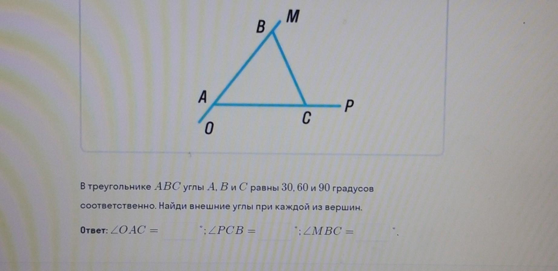 Зовнішні кути ∠ОАС = 180° - 30° = 150° ; ∠РСВ = 180° - 60° = 120° ;