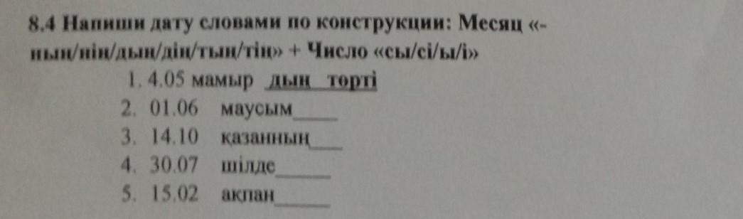 8.4 Напиши дату словами по конструкции: Месяц - нын/нiн/дын/д н/тын/тiн» + Часло 1. 4.05 мамыр дын торті 2. 01.06 маусым 3. 14.10 казаннын 4. 30.07 шілде 5. 15.02 пан